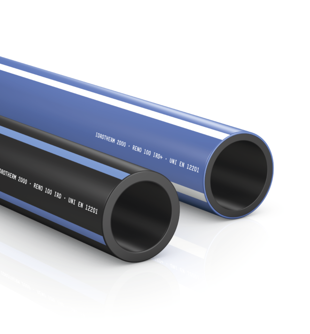 Tubi in polietilene PE100 (MRS 10) ad elevata resistenza ai disinfettanti a base di cloro (ipoclorito di sodio, diossido di cloro, clorammine…) con strato esterno di colore blu e strisce identificative bianche per la distribuzione dell’acqua per uso umano, usi generali ed applicazioni industriali. I tubi RENO IRD sono conformi alle norme ISO 4427, UNI EN 12201 ed ISO 15494, e proprietà igienico-sanitarie conformi alle prescrizioni normative del D.M. n. 174 del 6/4/2004 per il trasporto di acqua potabile.