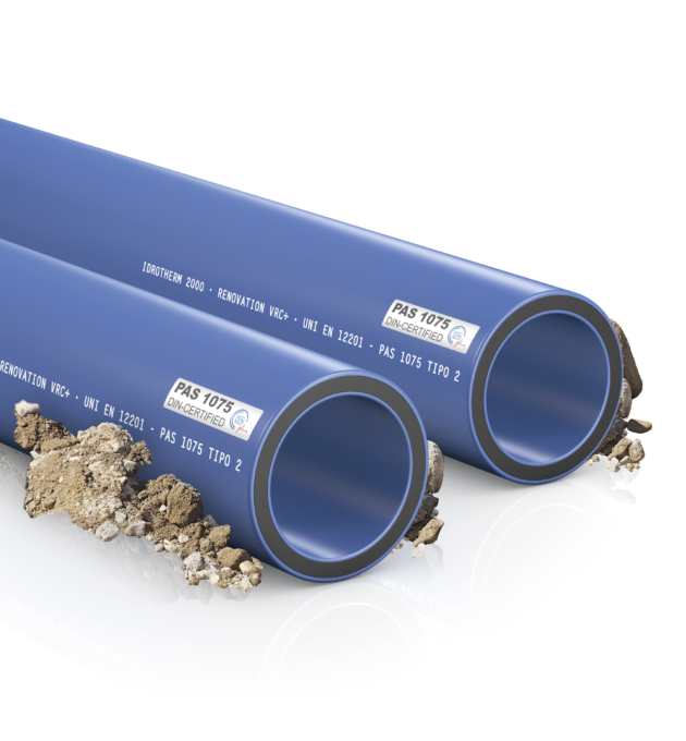 Tubi in polietilene PE100 RC (MRS 10) ad elevatissima resistenza alla fessurazione a struttura multistrato blu(interno)/nero (intermedio)/blu (esterno) per la distribuzione dell’acqua per uso umano, incluso il trasporto dell’acqua prima del trattamento, con caratteristiche conformi alle norme UNI EN 12201 ed ISO 4427 ed alla specifica tecnica PAS 1075 (Tipo 2) per le installazioni senza letto di sabbia o senza scavo, proprietà organolettiche conformi al D.Lgs. n. 31 del 2/2/2001 e verificate secondo UNI EN 1622 e proprietà igienico-sanitarie conformi alle prescrizioni normative del D.M. n. 174 del 6/4/2004 per il trasporto di acqua potabile.