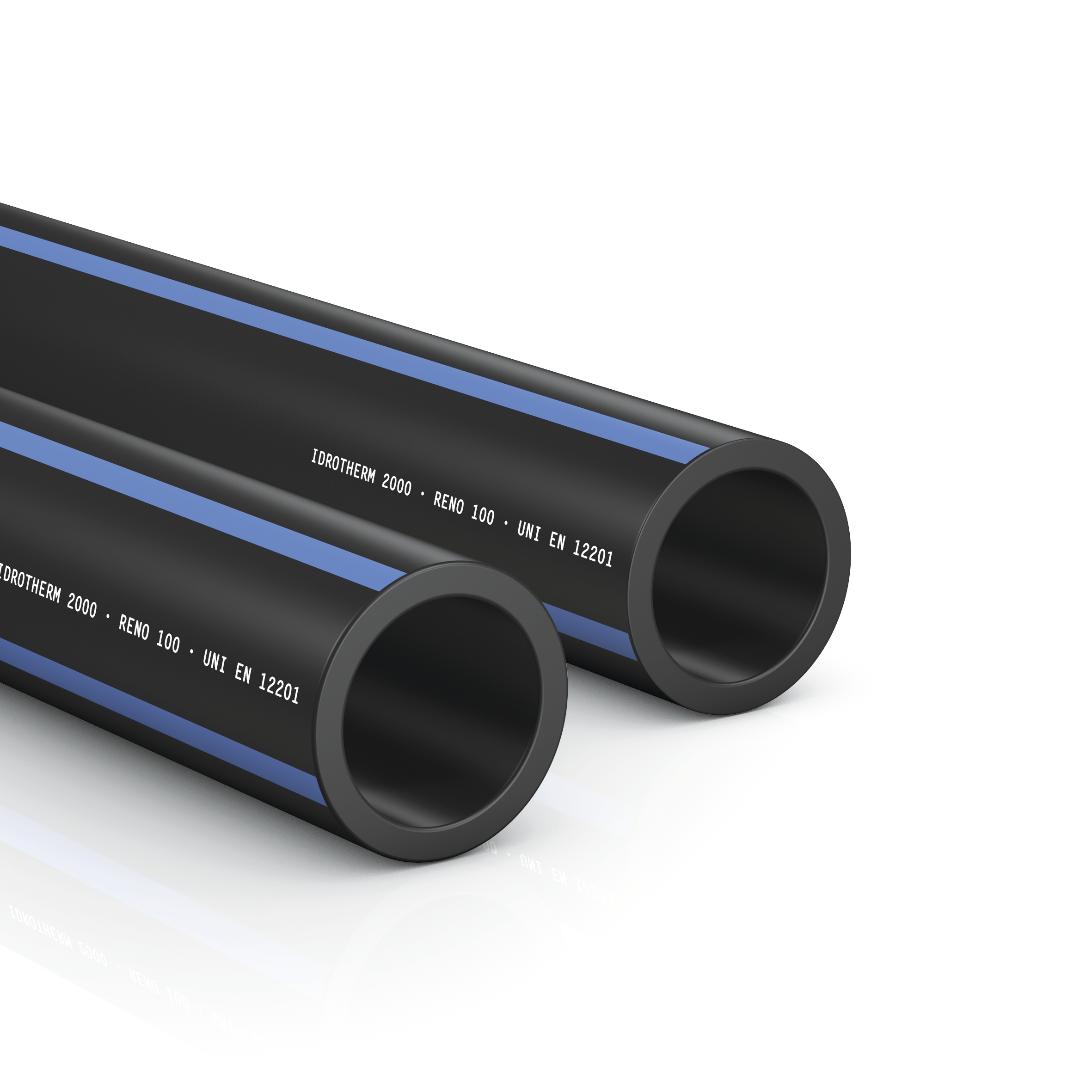 Il tubo in polietilene RENO 100 (o RENO 100 BLU nella colorazione interamente blu) è realizzato con polietilene PE100 (MRS 10 MPa) ed ha caratteristiche conformi allo standard EN 12201, il cui campo di applicazione prevede la distribuzione in pressione di acqua per uso umano, compreso il trasporto prima dei trattamenti.