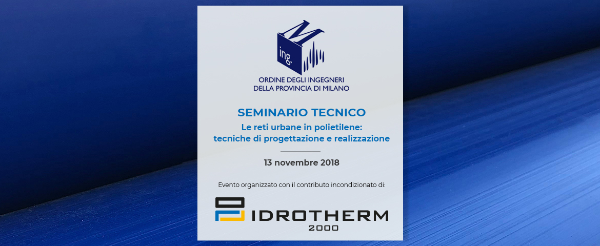 Dopo il successo del seminario tecnico "Progettare reti in polietilene"", tenutosi presso l’Ordine degli Ingegneri della provincia di Roma, comunichiamo che un nuovo seminario è in programma presso l’Ordine degli Ingegneri della provincia di Milano, martedì 13 novembre 2018, grazie al contributo incondizionato di Idrotherm 2000.
