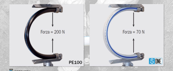 Abbiamo eseguito un test di flessione su un tubo DN32 secondo UNI EN ISO 10619-1 e possiamo dimostrare che il tubo in PE100 si flette applicando una forza pari a 200 N, mentre S-ONE si flette applicando una forza di appena 70 N.