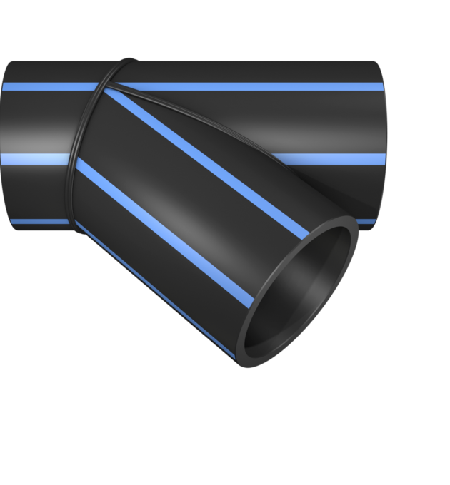 Tee a 45° formata a settori in PE100 realizzato tramite saldatura testa-testa di segmenti di tubo. Il raccordo, disponibile anche in PE100 RC o PE100 RT, trova applicazione nei sistemi per la distribuzione di acqua potabile in accordo con la norma UNI EN 12201 e negli impianti industriali in accordo con la norma UNI EN ISO 15494.