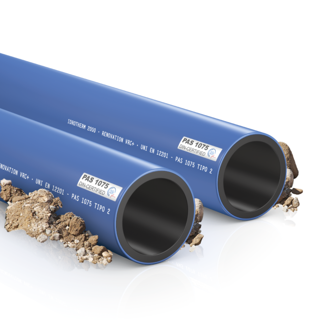 Tubi in polietilene PE100 RC (MRS 10) ad elevatissima resistenza alla fessurazione a struttura multistrato nero (interno)/blu (esterno) per la distribuzione dell’acqua per uso umano, incluso il trasporto dell’acqua prima del trattamento, con caratteristiche conformi alle norme UNI EN 12201 ed ISO 4427 ed alla specifica tecnica PAS 1075 (Tipo 2) per le installazioni senza letto di sabbia o senza scavo, proprietà organolettiche conformi al D.Lgs. n. 31 del 2/2/2001 e verificate secondo UNI EN 1622 e proprietà igienico-sanitarie conformi alle prescrizioni normative del D.M. n. 174 del 6/4/2004 per il trasporto di acqua potabile.
