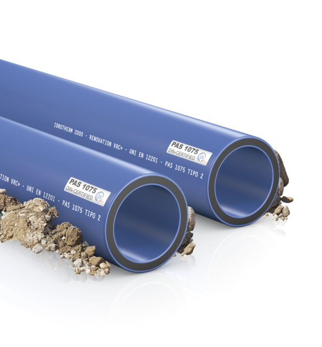 Tubi in polietilene PE100 RC (MRS 10) ad elevatissima resistenza alla fessurazione a struttura multistrato blu(interno)/nero (intermedio)/blu (esterno) per la distribuzione dell’acqua per uso umano, incluso il trasporto dell’acqua prima del trattamento, con caratteristiche conformi alle norme UNI EN 12201 ed ISO 4427 ed alla specifica tecnica PAS 1075 (Tipo 2) per le installazioni senza letto di sabbia o senza scavo, proprietà organolettiche conformi al D.Lgs. n. 31 del 2/2/2001 e verificate secondo UNI EN 1622 e proprietà igienico-sanitarie conformi alle prescrizioni normative del D.M. n. 174 del 6/4/2004 per il trasporto di acqua potabile.