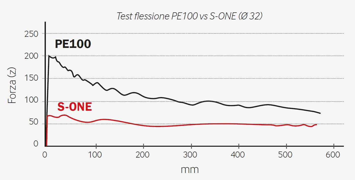 La caratteristica distintiva dei tubi S-ONE è rappresentata dall’eccezionale flessibilità, derivante dalla combinazione di materiali termoplastici altamente performanti con un’avanzata ed innovativa tecnologia produttiva basata sull’estrusione di profili multistrato. Il modulo elastico dei materiali utilizzati contraddistingue il tubo S-ONE per la migliore facilità con cui la condotta può essere curvata, con la risultante maggiore praticità di impiego nelle attività di posa e messa in opera (contenimento dei costi di giunzione e dei tempi di lavoro). Rispetto ad un tubo in PE100 con le stesse caratteristiche prestazionali è, infatti, sufficiente applicare una forza almeno 3 volte inferiore per poter flettere con la stessa curvatura il tubo S-ONE, come dimostrato dal test eseguito in accordo alla norma UNI EN ISO 10619-1.