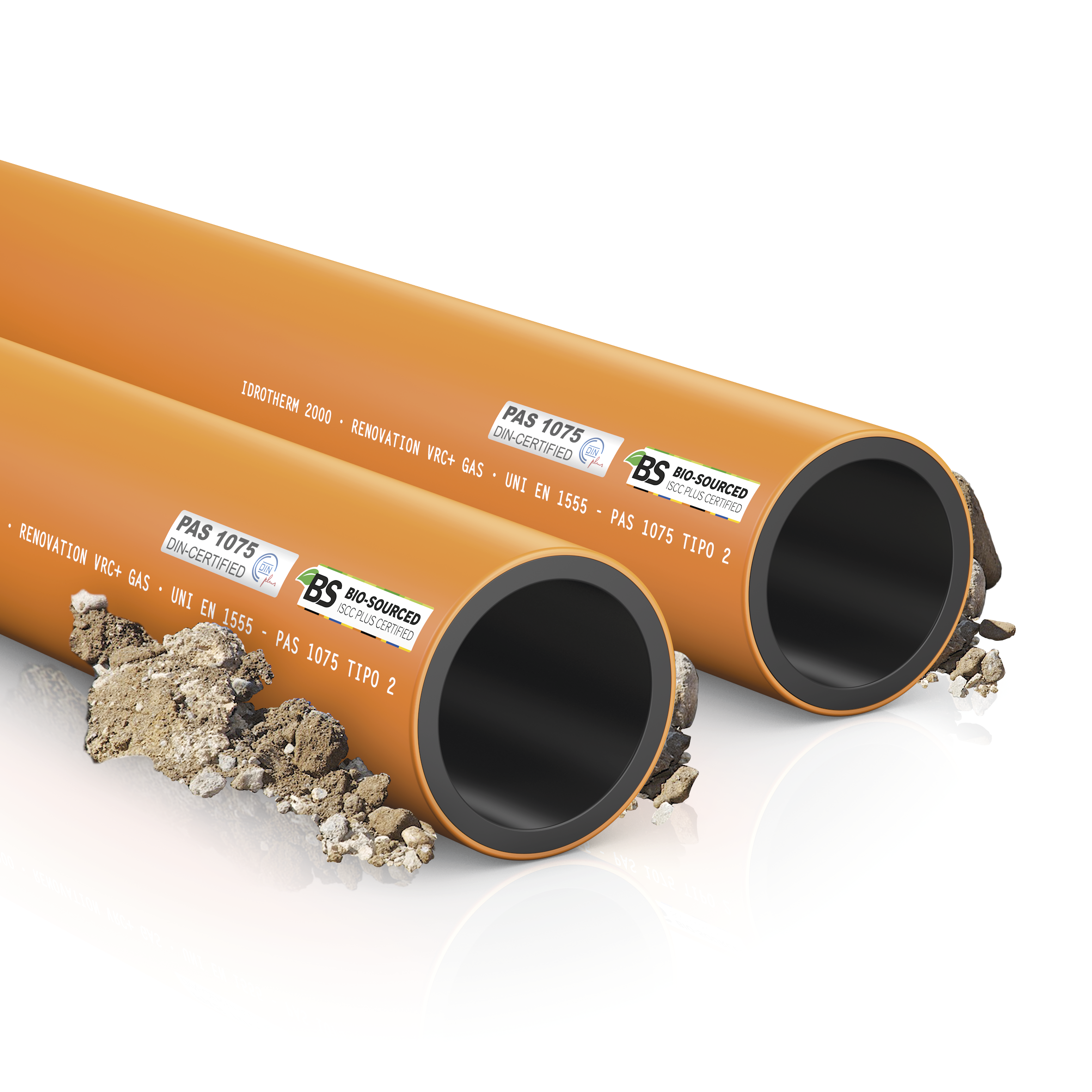 Tubi in polietilene PE100-RC (MRS 10) ad elevatissima resistenza alla fessurazione, a struttura multistrato nero (interno) ed arancio (esterno), per la distribuzione dei gas combustibili con caratteristiche conformi alle norme UNI EN 1555 ed ISO 4437, alla specifica tecnica PAS 1075 (Tipo 2) per le installazioni alternative ed alle regole tecniche del D.M. del 16/4/08.