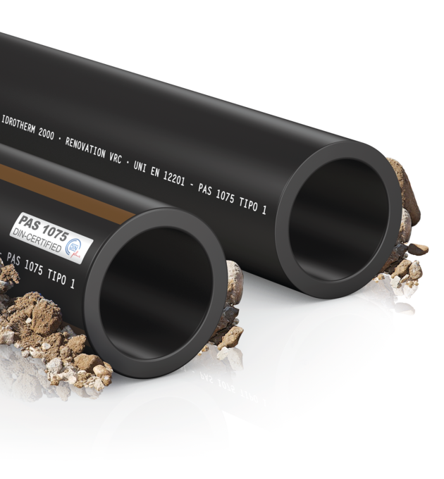 Tubi in polietilene PE100 RC (MRS 10) ad elevatissima resistenza alla fessurazione di colore nero, con eventuali strisce identificative marroni, per scarichi e fognature in pressione, sistemi di fognatura in depressione ed il trasporto di acqua non potabile, in applicazioni interrate o fuori terra, con caratteristiche conformi alla norma UNI EN 12201 ed alla specifica tecnica PAS 1075 per le installazioni senza letto di sabbia o senza scavo.