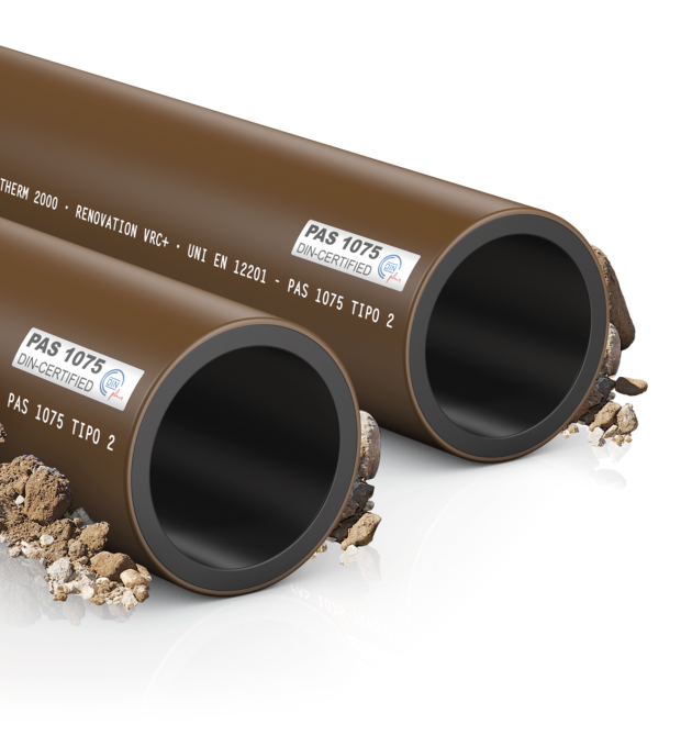 Tubi in polietilene PE100 RC (MRS 10) ad elevatissima resistenza alla fessurazione a struttura multistrato di colore nero (interno) e marrone (esterno), per scarichi e fognature in pressione, sistemi di fognatura in depressione ed il trasporto di acqua non potabile, in applicazioni interrate o fuori terra, con caratteristiche conformi alla norma UNI EN 12201 ed alla specifica tecnica PAS 1075 per le installazioni senza letto di sabbia o senza scavo.